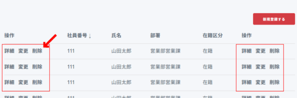 今回の原因は、上記の画像にもありますが、「詳細」「変更」「削除」の処理を一覧表の右と左の両方に表示していることでした。